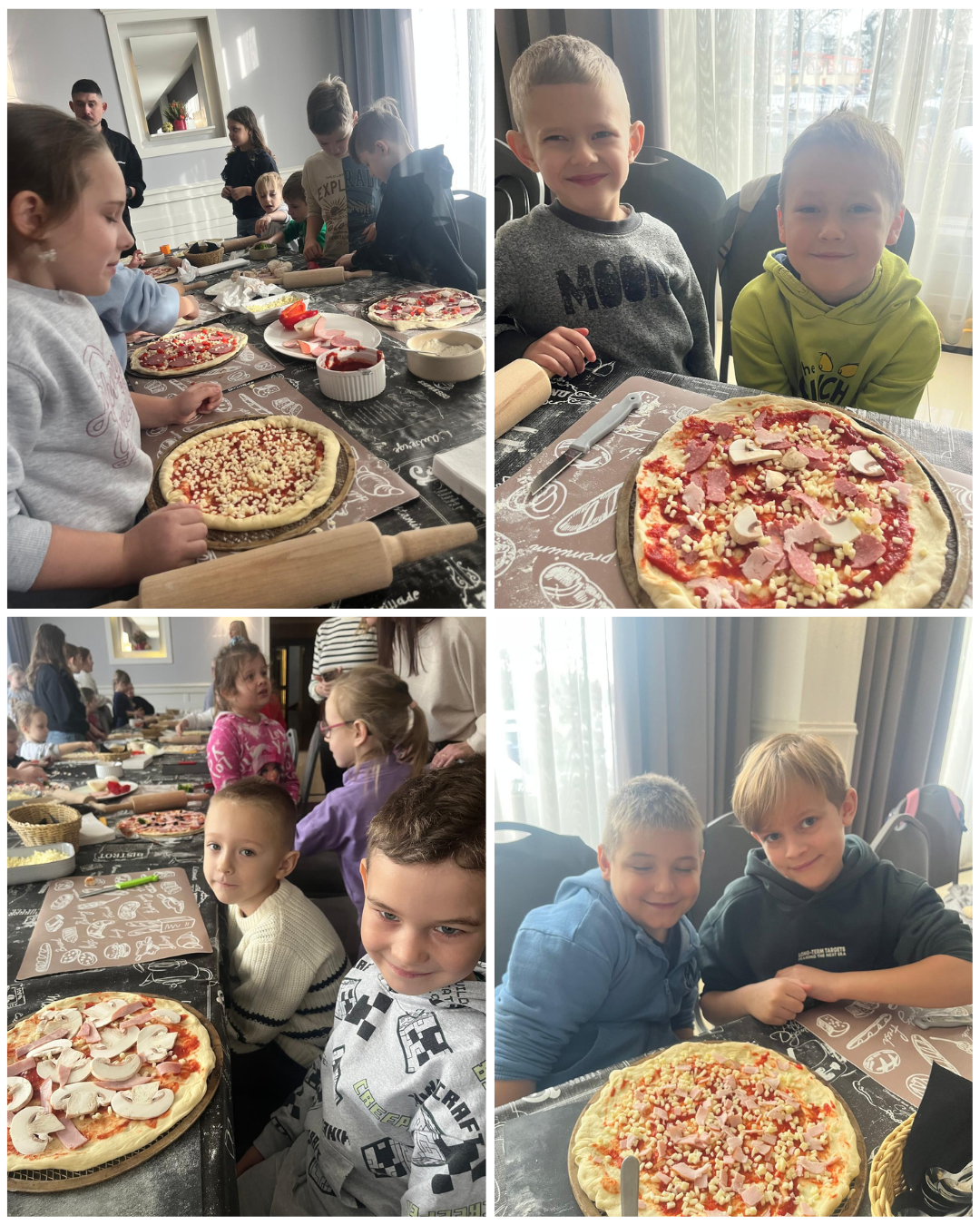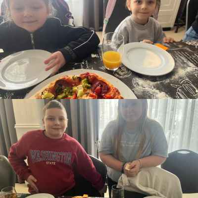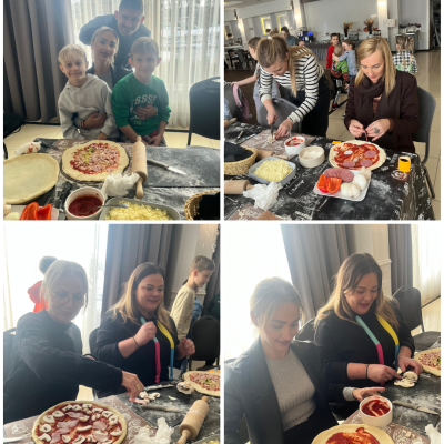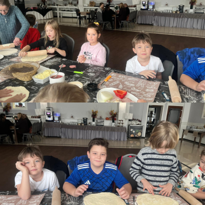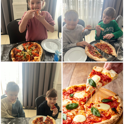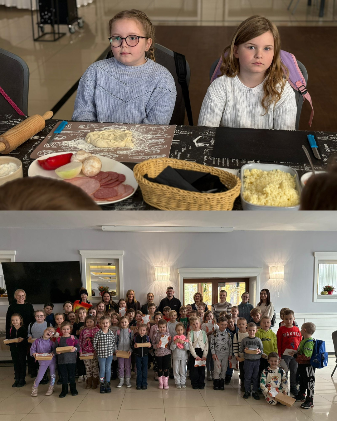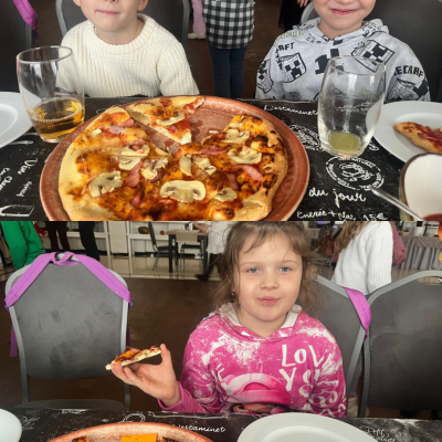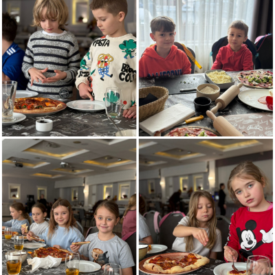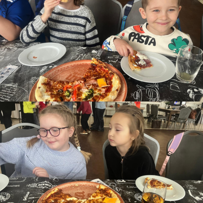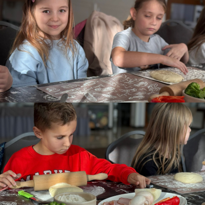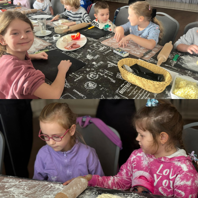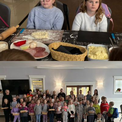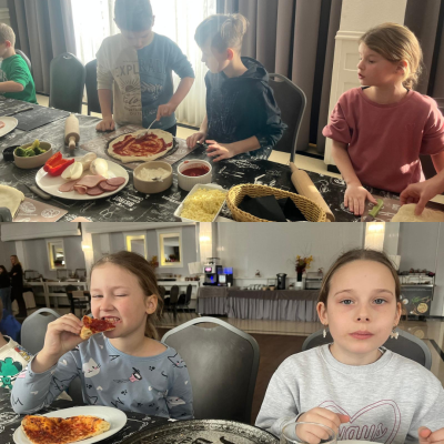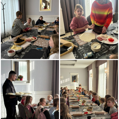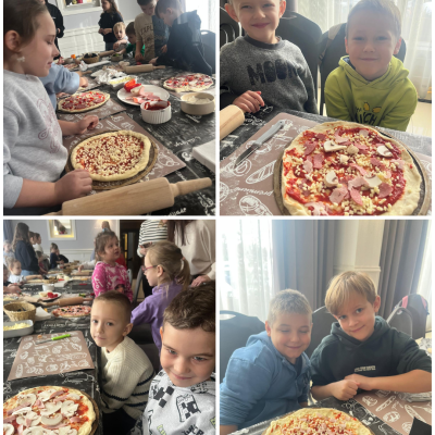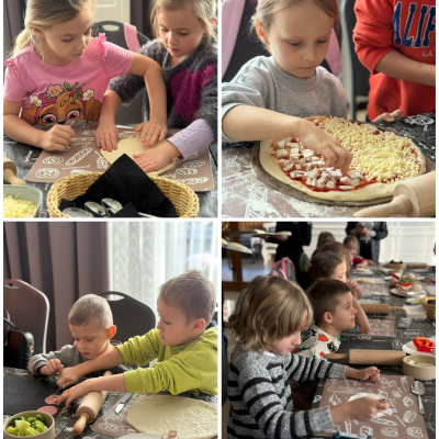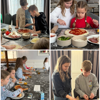 27 listopada 2025 roku uczniowie klas 0–3 naszej szkoły uczestniczyli w wyjątkowym, andrzejkowym wyjeździe do Hotelu Kosmowski we Wrześni.Celem wycieczki były warsztaty tworzenia pizzy, podczas których uczniowie mieli okazję zamienić się w prawdziwych kucharzy.Zajęcia poprowadził szef kuchni hotelu, który w ciekawy i przystępny sposób opowiedział dzieciom o całym procesie powstawania pizzy – od przygotowania ciasta, przez dobór składników, aż po wypiek w piecu. Następnie każdy uczestnik mógł stworzyć własną, niepowtarzalną kompozycję smakową. Mali kucharze samodzielnie kroili składniki, dobierali ulubione dodatki i układali je na przygotowanym wcześniej cieście.